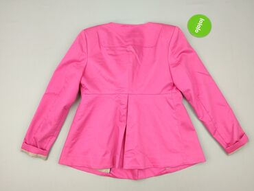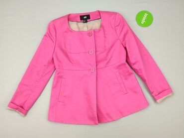 Krótki płaszcz damski marki H&M w intensywnym, różowym kolorze, wykonany z mieszanki bawełny i poliestru z dodatkiem elastanu, co zapewnia komfort noszenia. Posiada okrągły dekolt i zapięcie na trzy guziki, z eleganckimi pagonami na ramionach. Długie rękawy mogą być wywinięte, ukazując jaśniejszą podszewkę. Z przodu dwie dyskretne kieszenie. Idealny do noszenia na co dzień, dodający charakteru wiosennym i jesiennym stylizacjom.