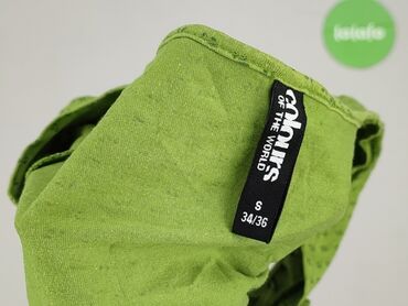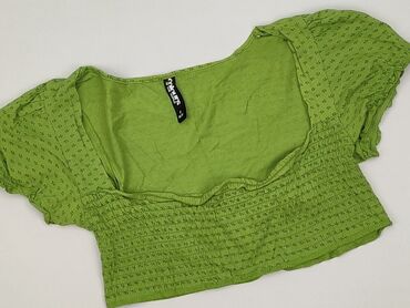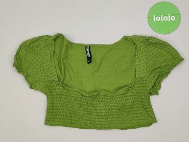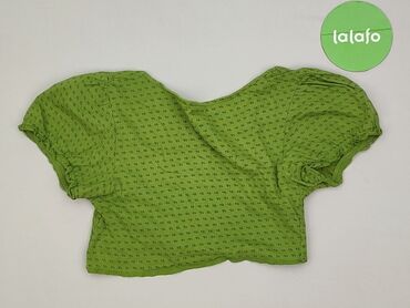 Bluzka damska Primark S - Rozmiar: S (z metki) - Fason: krótka (crop top), kopertowy przód z dekoltem w kształcie V - Rękaw: krótki - Wzór: zielono-białe, drobne falowane paski - Materiał: 97% pol...