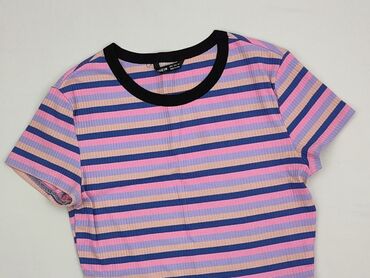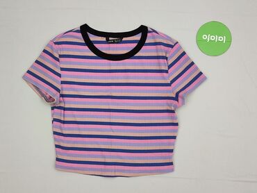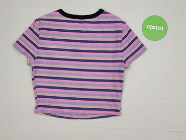 Bluzka damska SHEIN, krótki top w paski - Krój: crop top, dopasowany, z krótkim rękawem - Dekolt: okrągły z lamówką w czarnym kolorze i krótką listwą z dwoma guzikami - Wzór: poziome paski w odcie...