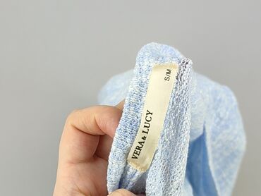 Ażurowy, ręcznie robiony sweterek/bluzka z krótkim rękawem w kolorze jasnego błękitu. - Dekolt w kształcie litery V. - Przód zdobiony pionowym, fantazyjnym splotem i aplikacją z drobnych, kremo...