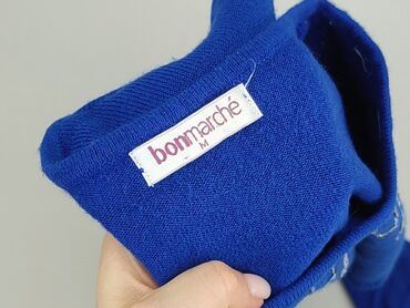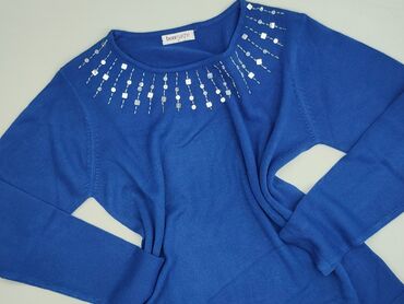 OkrągłyNiebieski sweter damski z długim rękawem, marki Bonmarche, w rozmiarze M. Sweter ma okrągły dekolt ozdobiony srebrnymi koralikami i cekinami w kształcie kwadratów i kół, tworząc wzór przypominający naszyjnik. Wykonany jest z akrylu, co zapewnia trwałość i łatwość w pielęgnacji. Rękawy i dół swetra zakończone są ściągaczami. Idealny do codziennych stylizacji, zapewnia komfort noszenia i dodaje elegancji.