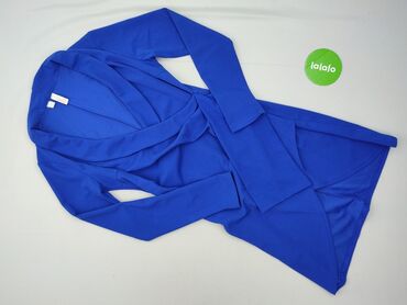 Błękitny żakiet/kamizelka wiązany w talii - Krój kopertowy z szerokim kołnierzem i paskiem z metalową klamrą do regulacji obwodu - Długie, lekko rozszerzane rękawy - Lekka, gładka tkanina o delika...