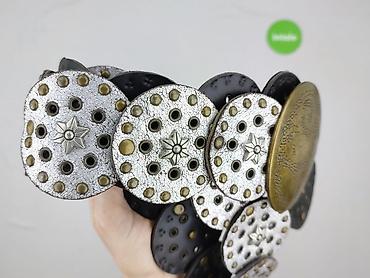 - Elementy: srebrzyste dyski z tłoczonym motywem gwiazdy i perforacjami, mosiężne/ złotone nity oraz duża, okrągła klamra w kolorze starego złota z dekoracyjnym grawerem
