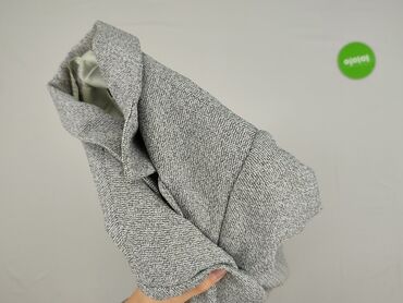 Damski płaszcz/żakiet w odcieniach szarości z drobnym, tkanym mikrowzorem (kratka/efekt „pepita”). Model z kołnierzem i dwurzędowym zapięciem na trzy guziki z przodu. Prosty, lekko pudełkowy krój do bioder. Długie rękawy. Dwie skośne kieszenie z przodu. Gładka, jasna podszewka.
