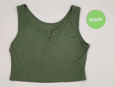 Top crop bez rękawów, prążkowany, w kolorze oliwkowej zieleni. - Krój: kopertowy przód z dekoltem w serek, szeroki pas u dołu, plecy zabudowane. - Materiał: dzianina pętelkowa/frotte z pionowymi p...