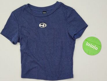 Top damski SHEIN, granatowy. - Fason: krótki crop top, lekko zaokrąglony dół, okrągły dekolt, krótkie rękawy - Materiał: prążkowana dzianina – 97% poliester, 3% elastan (rozciągliwy, dopasowuje si...