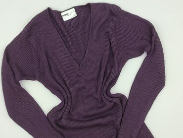 Sweter damski z dekoltem w serek, kolor śliwkowy/fioletowy. - Fason: dopasowany, długość do bioder - Dekolt: głęboki V z szerokim, prążkowanym ściągaczem i trzema ozdobnymi, metalicznymi nitami/ćw...Stan:
