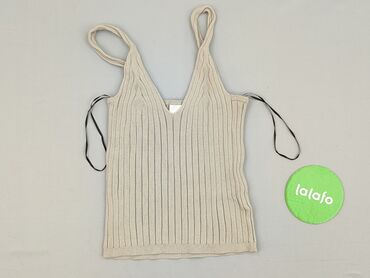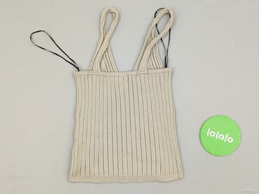Damski top na ramiączkach w beżowym kolorze, wykonany z prążkowanego materiału. Posiada okrągły dekolt i jest w rozmiarze S. Idealny na co dzień, na lato lub jako element stylizacji warstwowej. Mat...