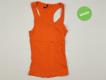 Bez rękawówPrążkowany top damski w żywym pomarańczowym kolorze, charakteryzujący się okrągłym dekoltem i krojem typu bokserka. Wykonany jest z elastycznego materiału, co zapewnia dopasowanie do sylwetki. Ten model sprawdzi się idealnie jako element codziennych, letnich stylizacji lub jako baza pod inne ubrania.