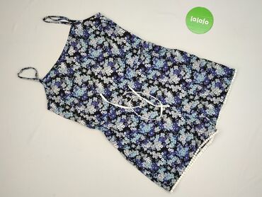 Ten damski romper charakteryzuje się czarnym tłem z wyrazistym, kolorowym nadrukiem w liście i kwiaty, w odcieniach fioletu, błękitu, zieleni i różu. Posiada szerokie ramiączka i regulowane wiązani...