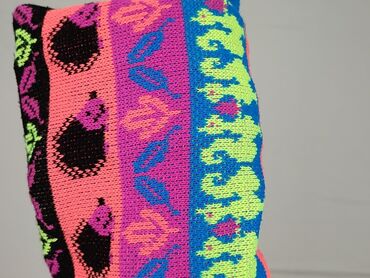 - Kolorystyka i wzór: intensywne neonowe barwy (błękit, róż, czarny, limonkowy, fiolet) ułożone w pasy. Motywy zwierzęce i roślinne – jeże, ptaki/ryby, liście, styl retro
