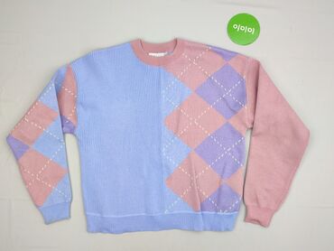 Sweter damski Pins and Needles, rozmiar S - Fason: luźny, z okrągłym dekoltem i długim rękawem - Dzianina o wyraźnej, ażurowej strukturze “bouclé” - Wzór: poziome pasy w kolorach zielonym, niebies...