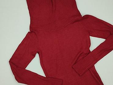Sweter damski – prążkowany golf/tuba, kolor bordowy - Fason: dopasowany, wydłużony (tunika), długi rękaw - Kołnierz: półgolf/golf z wycięciem w kształcie trójkąta przy dekolcie - Dzianina: elastyc...
