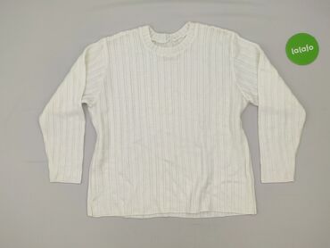 Sweter damski, kremowy/ecru, dzianina prążkowana - Fason: luźny, z obniżoną linią ramion - Dekolt: okrągły, ściągacz - Rękawy: długie, lekko bufiaste z ażurową linią przy dolnej części, zakończone...