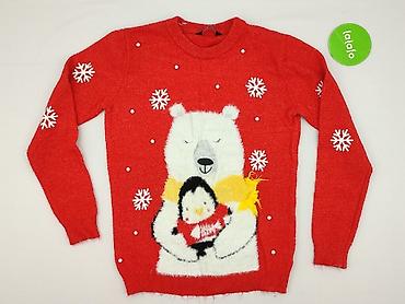 Sweter świąteczny damski Ckh Clockhouse, rozmiar L - Kolor: czerwony z białymi śnieżynkami - Nadruk/przód: pingwin w przebraniu choinki, aplikacje 3D (kolorowe pomponiki), cekinowa gwiazdka i napi...
