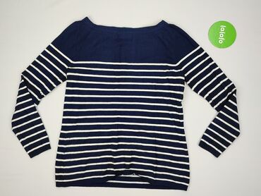 Damski sweter UP2FASHION, paski - Model: cienki sweter z długim rękawem - Kolorystyka: granat w poziome pasy melanżowego błękitu; kontrastowe koralowe lamówki przy dekolcie, na mankietach i dole -...