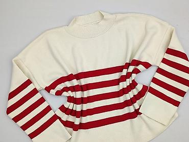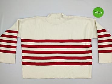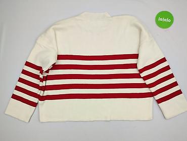 Sweter damski, krótki/cropped, ręcznie dziergany wygląd. Kolor ecru z szerokim, kontrastowym pasem na środku w barwach: granat – czerwony – granat. Gruby, elastyczny splot, obniżona linia ramion i ...
