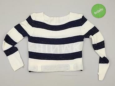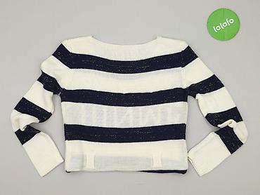 Sweter damski w paski, krótki (cropped) - Krój: skrócony, z długim rękawem - Wzór: szerokie, poziome pasy w kolorze granatowym i ecru/białym - Dekolt: łódkowy - Dzianina: średniej grubości, spręży...Stan: