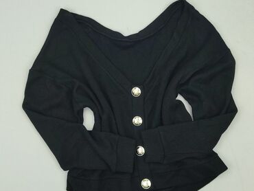 Czarny sweter damski z długim rękawem, charakteryzujący się dekoltem w kształcie litery V, który jest zapinany na trzy guziki. Jego klasyczny design sprawia, że jest to uniwersalny element garderob...