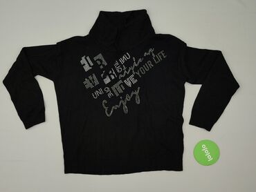 Czarny damski sweter z golfem i długim rękawem. Przód ozdobiony aplikacją z drobnych połyskujących dżetów z napisem „Enjoy your life” oraz dekoracyjnymi elementami w formie liter/cyferek. Miękki, cienki dzianinowy materiał, ściągacze u dołu i przy mankietach, luźniejszy krój. Idealny do codziennych stylizacji – do dżinsów, spódnic czy pod marynarkę.