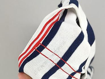 - Klasyczny, marynistyczny wzór: szerokie poziome pasy w kolorze granatowym i białym z przodu; z tyłu węższe pasy oraz dekoracyjny czerwony pionowy akcent na środku pleców