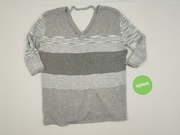 Sweter damski w paski, rozmiar S - Fason: z dekoltem w serek (V-neck), długi rękaw, ściągacze przy mankietach i u dołu - Wzór: szerokie poziome pasy w kolorach białym i jasnoszarym; ażurowe, drobn...