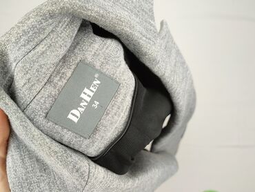 Szary blazer DanHen dla kobiet, rozmiar 34. Charakteryzuje się melanżowym materiałem w odcieniach szarości, z czarnymi, wpuszczanymi kieszeniami i pojedynczym czarnym guzikiem, co nadaje mu nowoczesny wygląd. Kołnierz jest klasycznie wycięty, a wewnętrzna podszewka jest czarna. Marynarka doskonale sprawdzi się w stylizacjach biznesowych oraz casualowych.