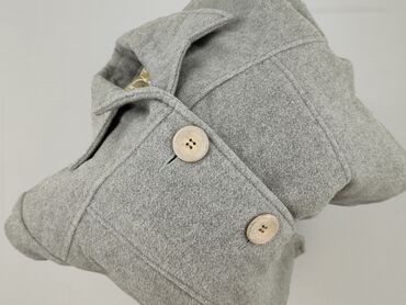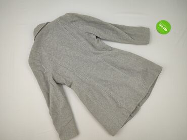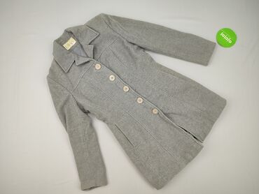 Szary płaszcz damski z długimi rękawami to elegancki element garderoby, idealny na chłodniejsze dni. Posiada klasyczny kołnierz i zapięcie na guziki, które dodają mu szyku. Jest to używana odzież damska, która zachowuje idealny stan, co sprawia, że jest praktycznym wyborem na różne okazje. Płaszcz ma prosty krój, który pasuje do wielu stylizacji, od codziennych po bardziej formalne.
