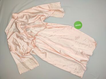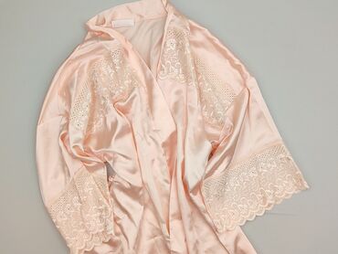 Jedwabisty szlafrok/kimono damskie - Kolor: pudrowy róż, z delikatnym połyskiem - Fason: luźny, otwarty przód bez zapięcia; długość do połowy uda; rękaw 3/4 o kroju kimono - Materiał: 100% poliest...Stan: