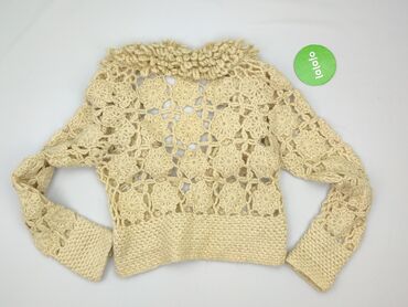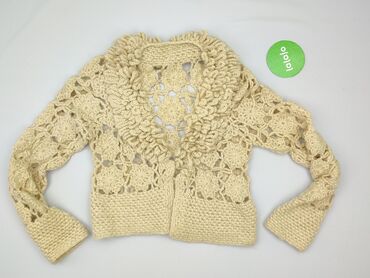 Ażurowy kardigan damski na guziki - Kolor: ecru/kremowy - Krój: krótki kardigan z długim rękawem, lekko rozszerzane mankiety - Zapięcie: pięć drewnianych guzików z przodu - Splot: ręcznie wyglądaj...