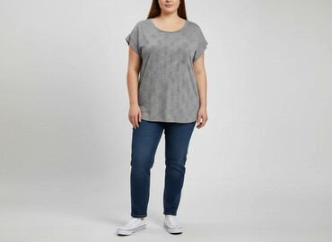 Szara koszulka damska BEL0VED WOMAN - Rozmiar: 3XL (z metki) - Kolor: jasny szary melanż - Krój: klasyczny T‑shirt z krótkim rękawem i okrągłym dekoltem - Wzór: całość pokryta drobnym, diagonalnym...