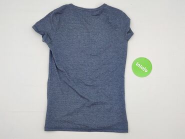 T-shirt damski, granatowo-niebieski (chabrowy), krótki rękaw. - Fason: dopasowany, z głębszym, zaokrąglonym dekoltem z przodu i z tyłu. - Rozmiar: M (oznaczenie „ROZMIAR M” na metce nadrukowanej). ...