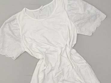Biała bluzka damska z koronkową aplikacją - Krój: luźny, z krótkim rękawem - Dekolt: okrągły - Materiał: miękka dzianina od spodu + ażurowa, koronkowa warstwa wierzchnia - Detale: dekoracyjny, gęs...