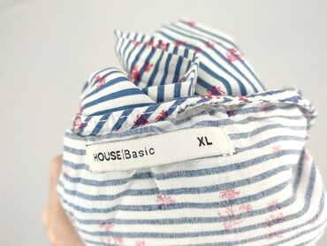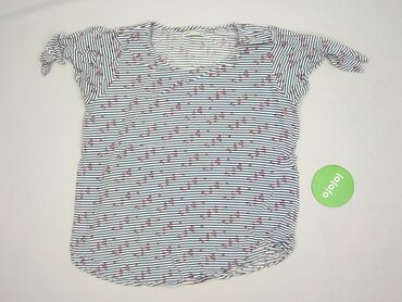 T-shirt damski w paski - Krój: klasyczny, z krótkim rękawem - Dekolt: okrągły, wykończony granatową lamówką - Wzór: drobne, poziome paski granatowo-białe - Długość: standardowa - Materiał: miękka,...Stan: