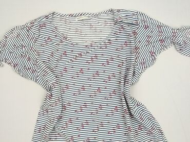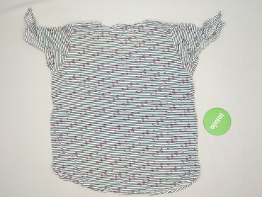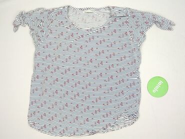 Damska koszulka z krótkim rękawem - Krój: prosta, swobodna, z okrągłym dekoltem - Wzór/kolor: blokowe połączenie kolorów – górna część biała, środkowy pas w drobne granatowo-białe paski, dolna czę...