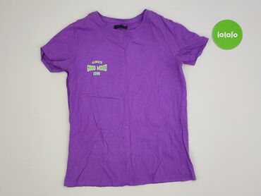 Fioletowa koszulka damska z krótkim rękawem. - Rozmiar: S (z metki) - Krój: klasyczny T-shirt, lekko luźny - Dekolt: okrągły z ozdobnym pęknięciem i kolorową kokardką - Materiał: miękka, cienka dz...