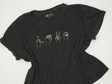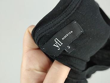 T-shirt damski Reserved, rozmiar S. Kolor czarny, krój krótki/cropped z podwiniętymi rękawkami. Na przodzie minimalistyczny nadruk z konturami dłoni układających gesty (m.in. L, OK, V, pięść) wykonany cienką białą linią z delikatnymi akcentami różu. Okrągły dekolt, miękka dzianina bawełniana przyjemna w dotyku. Tył gładki, bez nadruku.