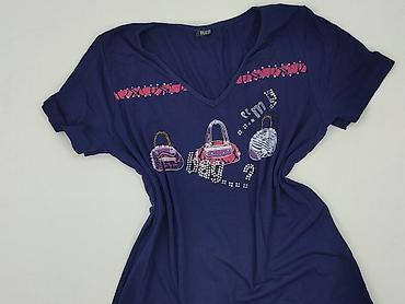 Ciemnoniebieska bluzka damska marki TU z krótkim rękawem. Bluzka charakteryzuje się luźnym fasonem i okrągłym dekoltem. Na przodzie widoczny jest wzór w poziome, przecierane pasy z tekstem. Wykonan...