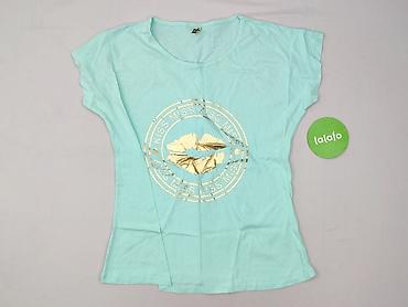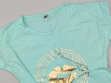 Turkusowa koszulka damska z nadrukiem - Marka: EMOLA collection (metka widoczna na zdjęciu) - Rozmiar: L - Krój: lekko taliowany, z krótkimi, opadającymi rękawkami (kimono cap sleeves), okrągły de...
