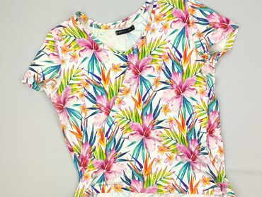 Bluzka/t-shirt damski Mohito Collection, rozmiar M. - Krótki rękaw z podwinięciem, okrągły dekolt - Przód z nadrukiem tropikalnym: liście, kwiaty, papuga, koliber, motyl - Aplikacje z cekinów w od...T-shirt damski Mohito Basic