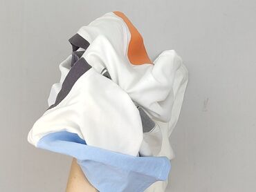 - Kolorystyka typu color-block: korpus biały, rękawy w dwóch kolorach (jeden błękitny, drugi pomarańczowy)