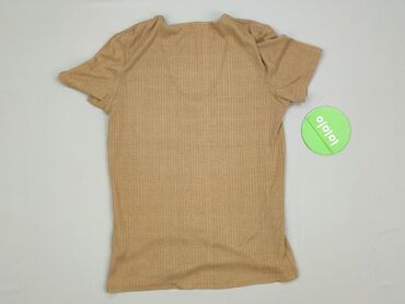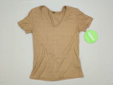 Beżowa bluzka damska z dekoltem V - Krój: luźny T-shirt z krótkim rękawem, delikatne marszczenie na ramionach - Dekolt: głęboki w kształcie litery V z podwójną lamówką - Rozmiar z metki: M - Kolor...
