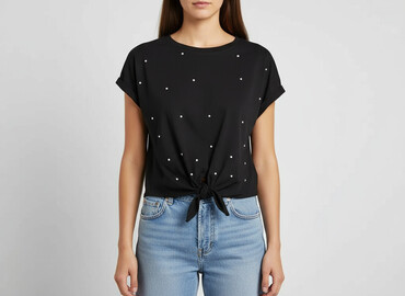 Czarna koszulka damska Reserved, rozmiar S. - Fason: lekko luźny T‑shirt z krótkim rękawem typu cap. - Dekolt: okrągły. - Ozdoby: aplikacja z błyszczących dżetów układających się w kwiatowe wzory ...