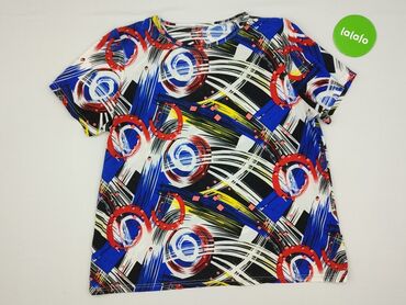 Bluzka damska z krótkim rękawem, rozmiar 36. - Wzór: geometryczno-ornamentalny, mozaika w odcieniach błękitu, granatu, szarości, bieli i żółci. - Dekolt: okrągły z ozdobnym wiązaniem/sznureczkiem...