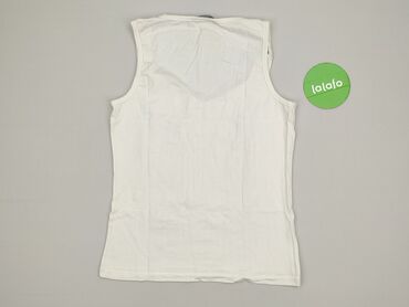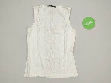 Biała damska bluzka bez rękawów z koronkową wstawką - Fason: luźny, prosty krój z delikatnym marszczeniem z przodu - Dekolt: okrągły - Tył: zapięcie na mały guziczek przy karku - Ozdoby: szeroki p...