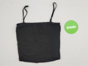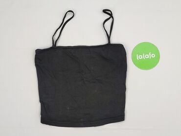 Czarny top typu bandeau z cienkimi ramiączkami spaghetti. - Fason: krótki, dopasowany, bez dekoltu, prosta linia góry i dołu. - Materiał: 100% poliester; elastyczna, drobno Marszczona/żakardowa...