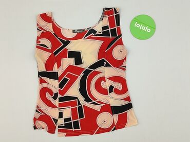 Top damski bez rękawów z lekkiego, półprzezroczystego materiału. Wzór: okręgi w odcieniach granatu, niebieskiego, bieli i złamanej żółci na drobno nakrapianym tle. Krój luźny, przewiewny, idealny n...