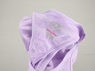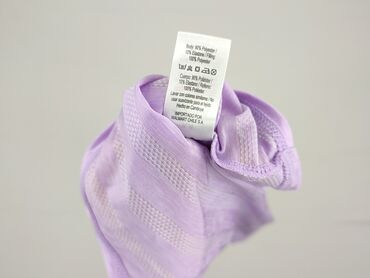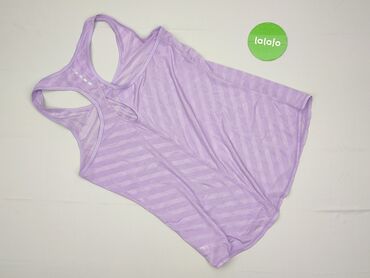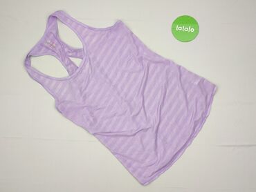 Bez rękawówDamski top bez rękawów w odcieniu lawendowym, idealny do aktywności fizycznej lub jako element codziennego stroju. Wykonany z lekkiego, oddychającego materiału z poziomymi paskami o różnej przezroczystości, co dodaje mu unikalnego wyglądu. Fason bokserki z tyłu zapewnia swobodę ruchów i komfort podczas noszenia. Materiał to głównie poliester, co gwarantuje trwałość i szybkie schnięcie. Produkt używany, w idealnym stanie.