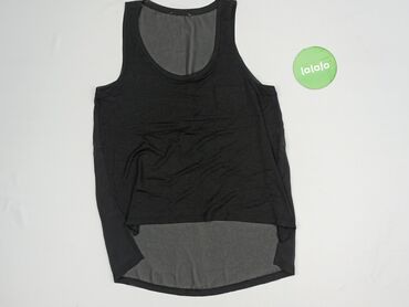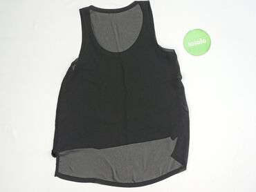 Bez rękawówTen damski top bez rękawów w kolorze czarnym to uniwersalny element garderoby. Charakteryzuje się okrągłym dekoltem, zapewniającym klasyczny wygląd, oraz asymetrycznym dołem z dłuższym tyłem, co dodaje mu nowoczesności. Top jest wykonany z lekkiego, zwiewnego materiału, który jest częściowo przezroczysty, co czyni go idealnym na cieplejsze dni lub jako warstwa bazowa pod inne ubrania. Z przodu na wysokości klatki piersiowej znajduje się mała kieszonka. Przeznaczony dla kobiet, które cenią sobie swobodę i styl w codziennych stylizacjach. Idealny do noszenia na co dzień, na spacer, czy na nieformalne wyjścia. Jest to używany produkt, ale w idealnym stanie, co świadczy o jego dobrej jakości i trwałości.