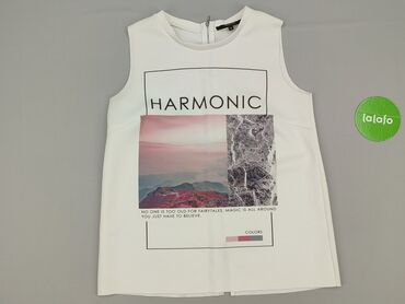 Jasny top damski marki Reserved w rozmiarze XS, charakteryzujący się tropikalnym wzorem w intensywnych kolorach. Dominują odcienie zieleni, czerwieni, błękitu i żółci, które tworzą dynamiczny i świ...